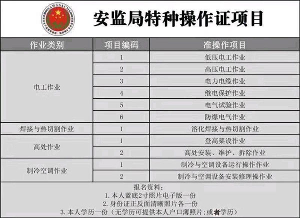 南充市應(yīng)急管理廳(原安監(jiān)局):低壓電工證,高壓電工證,焊工證-熔化焊接與熱切割作業(yè),電工證-電力電纜,電工證-繼電保護(hù),電工證-電氣試驗(yàn),防爆電氣作業(yè),高處安裝維護(hù)拆除作業(yè),登高架設(shè)作業(yè),制冷與空凋設(shè)備運(yùn)行操作作業(yè),制冷與空凋設(shè)備安裝修理作業(yè),施工吊裝作業(yè),施工挖裝作業(yè),危化品負(fù)責(zé)人/管理人員,?;窂臉I(yè)人員上崗證,特種作業(yè)人員必須經(jīng)專門的安全技術(shù)培訓(xùn)并考核合格,取得《中華人民共和國(guó)特種作業(yè)操作證》(以下簡(jiǎn)稱特種作業(yè)操作證)后,方可上崗作業(yè)。
